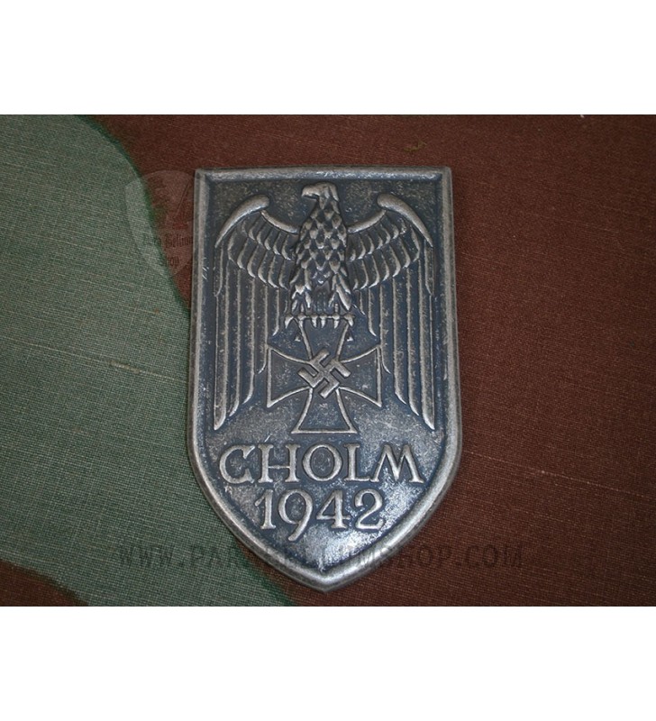 Established on July 1, 1942 by wish of the Generalmajor Theodor Scherer who presented it to Adolf Hitler to reward the winners of the defense battle of Cholm and accompanied by a certificate and registered on the Wehrpass and Soldbuch. The only holder of the endorsement of the certificate of the award was the Generalmajor Scherer. The shield was applied on the upper part of the left sleeve of the jacket and the assignment ended on December 31st 1942.