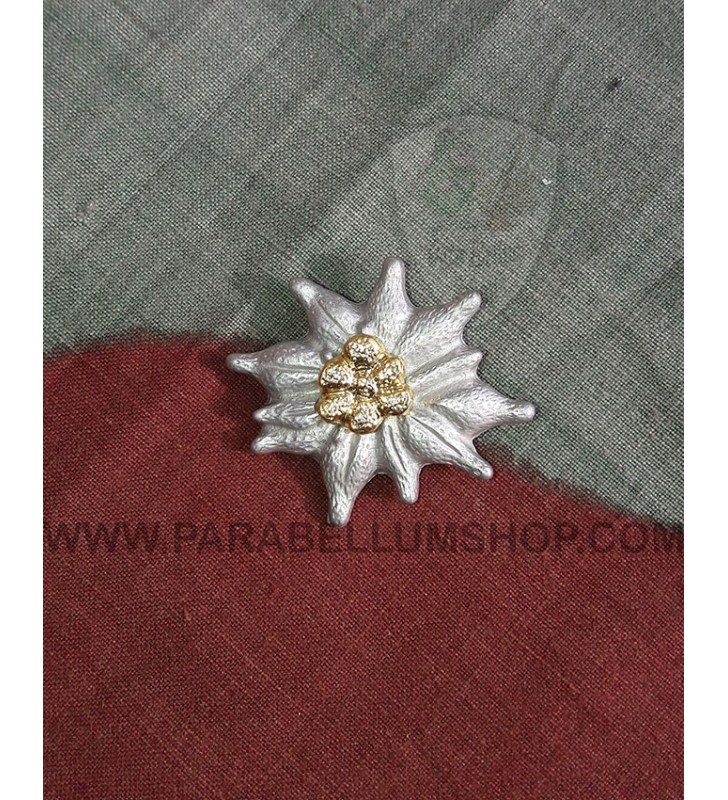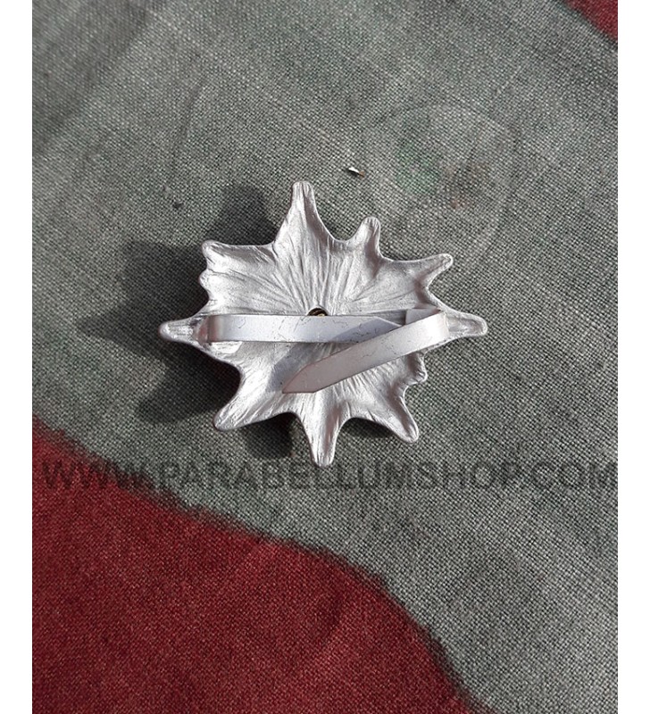 Reproduction of Edelweiss in the model used in World War II by German officer on their schirmmütze, made in aluminum, that characterized the units of Gebirgsjager, the mountain troops of the Wehrmacht. Usually applied on the left side of the officer visor cap by two pins.