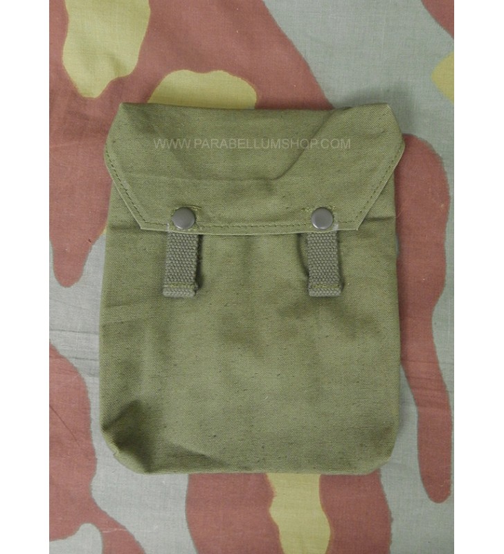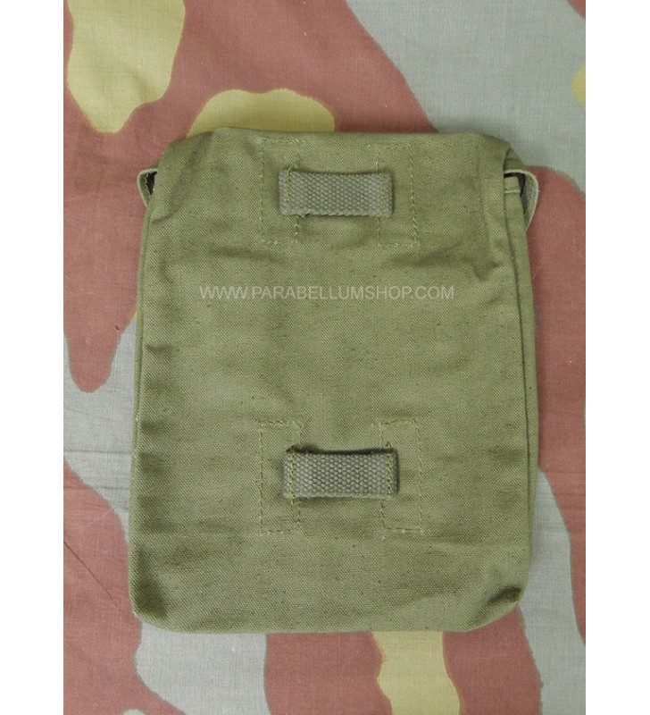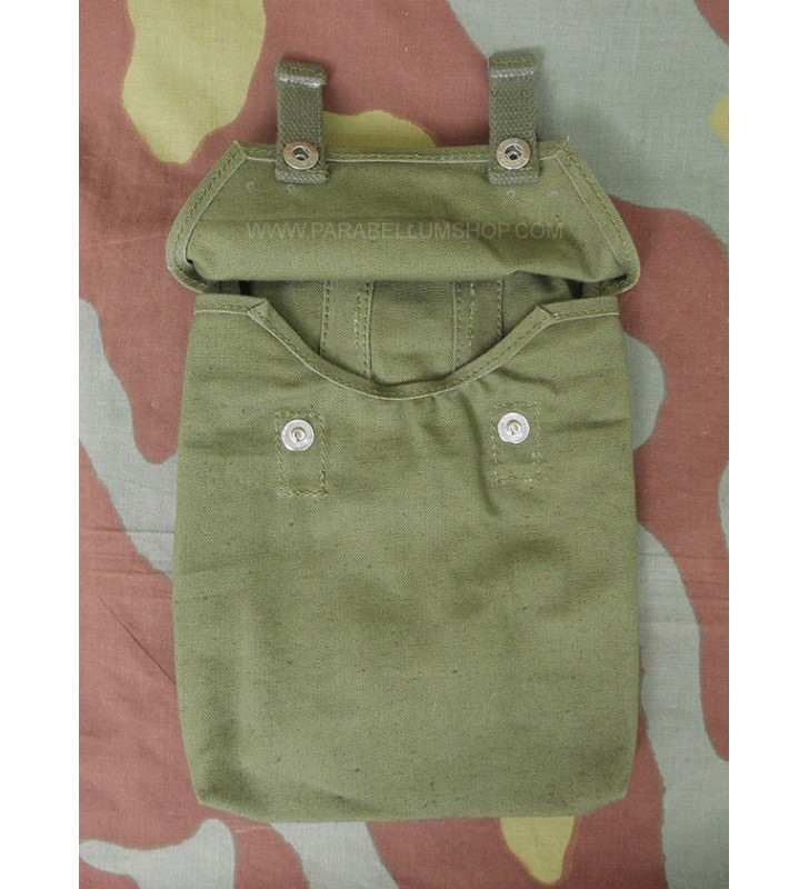 Reproduction of the bag that contained the anti-mustard sheet which was combined with the gas mask canister used in the German Army during the Second World War as essential equipment. The cotton bag is sealed by two snap buttons and on the back two loops allowed it to be attached to the mask canister shoulder strap.