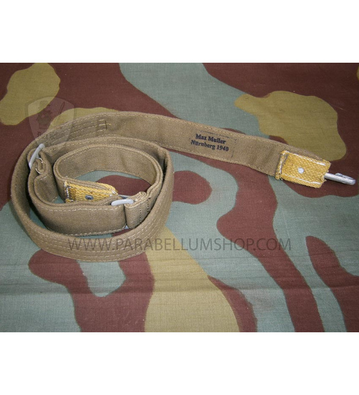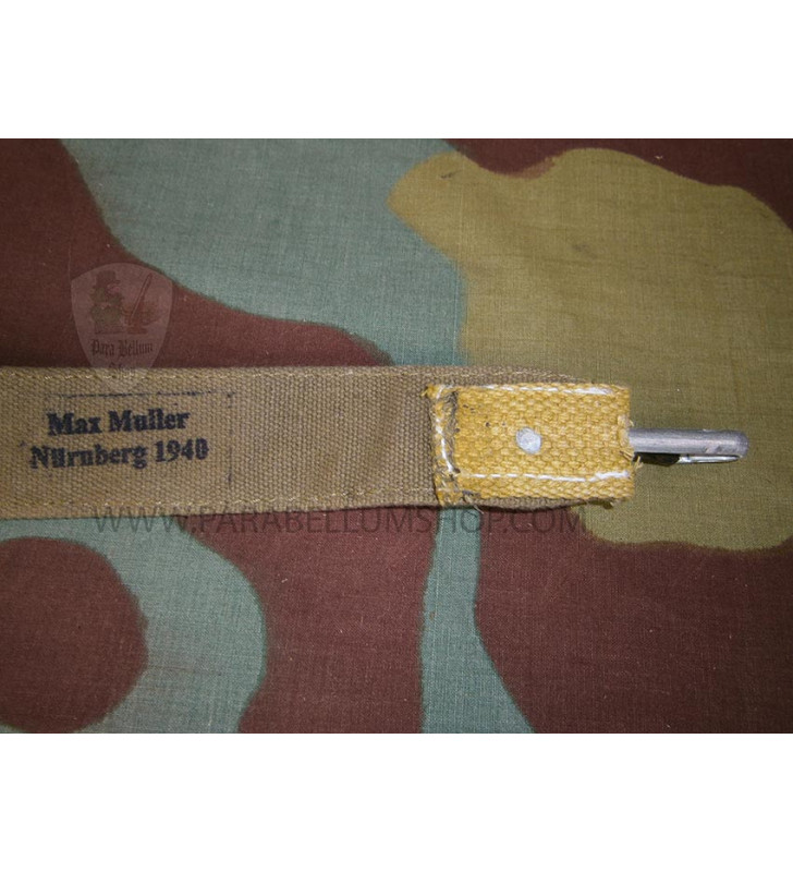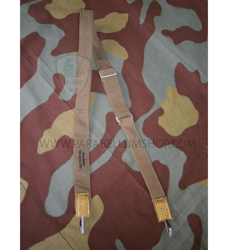 Reproduction of sling for breadbag used by Werhmacht, for the tropical climate which were characterized for the substitution of the leather parts with cotton canvas. Complete with producer stamps.