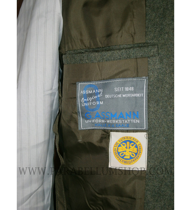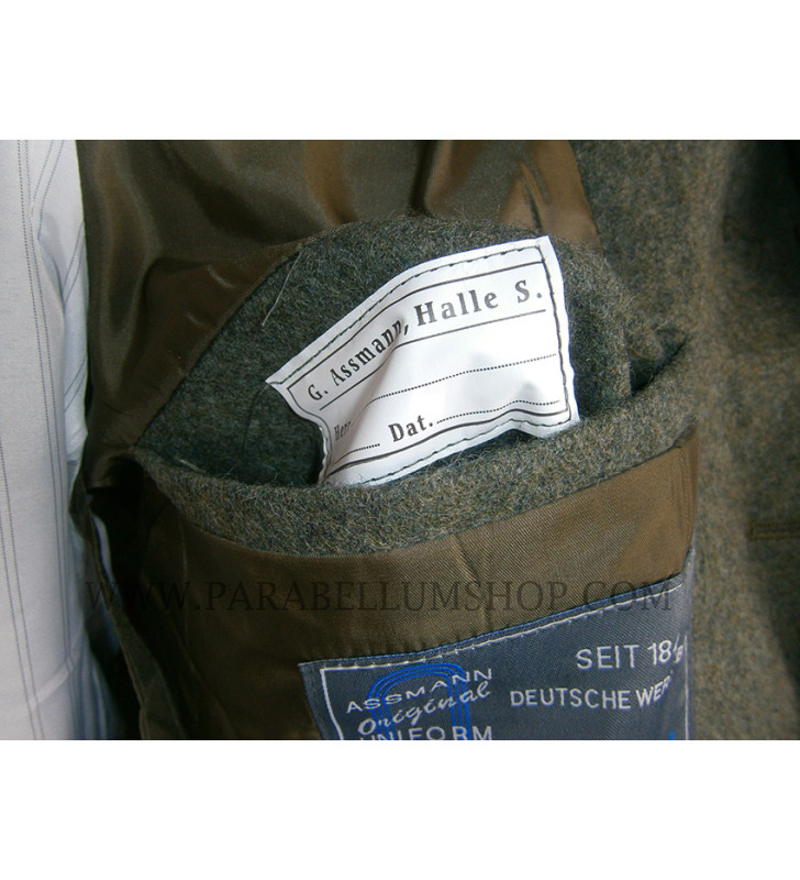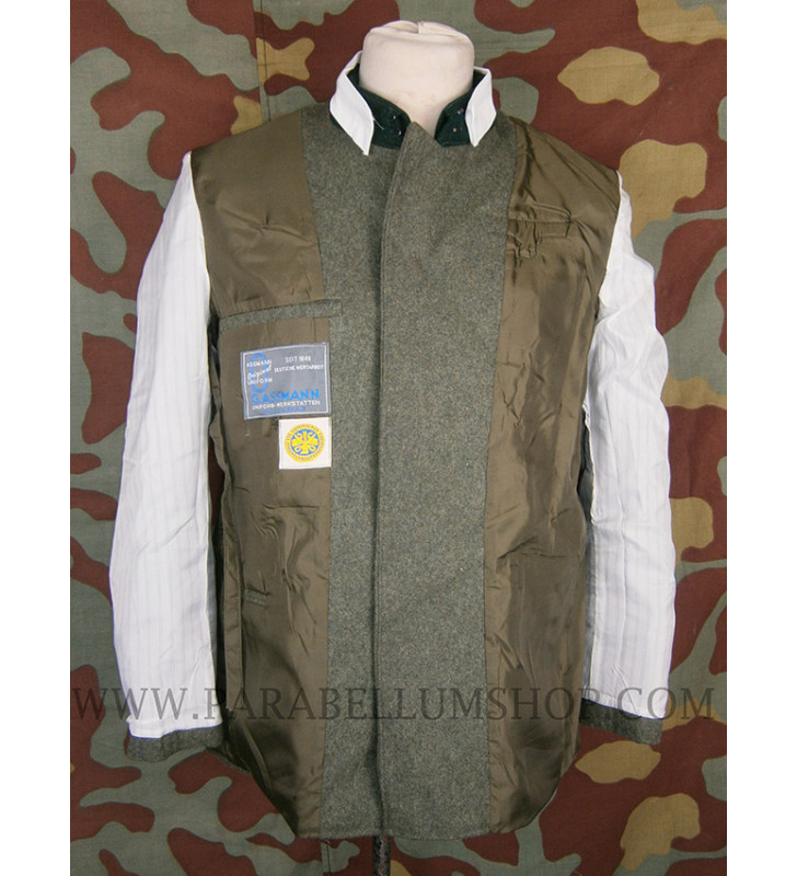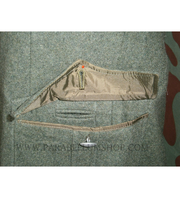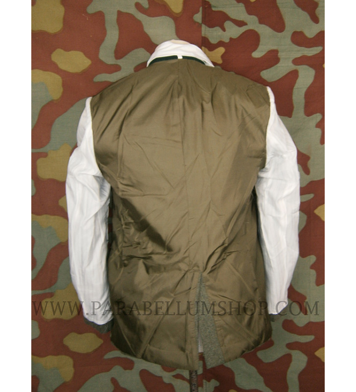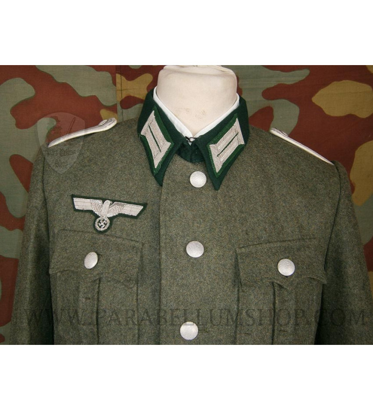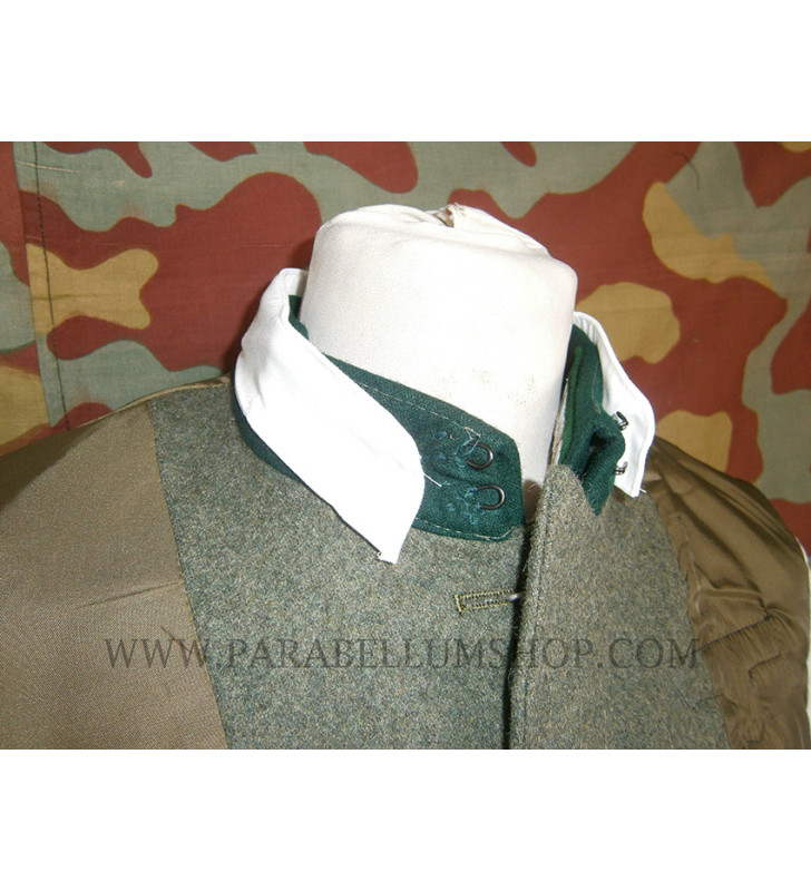Feldgrau cloth jacket reproducing the model that Heer's officers used to be tailored for the field service, characterizing it with all the peculiarities that distinguished the officers' service jackets. Internally it is lined with fabric reproducing the rayon, or artificial silk, the shoulder board are sewn on the shoulder, the high collar with embroidered tabs and the sleeve with the double finish. The lower left pocket is also set up to house the officer's frog, and the manufacturer's labels are sewn internally and the owner's name is written.