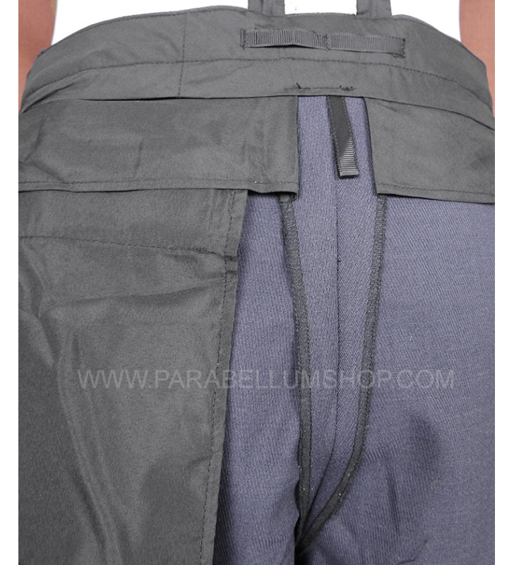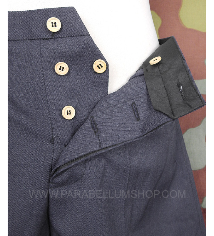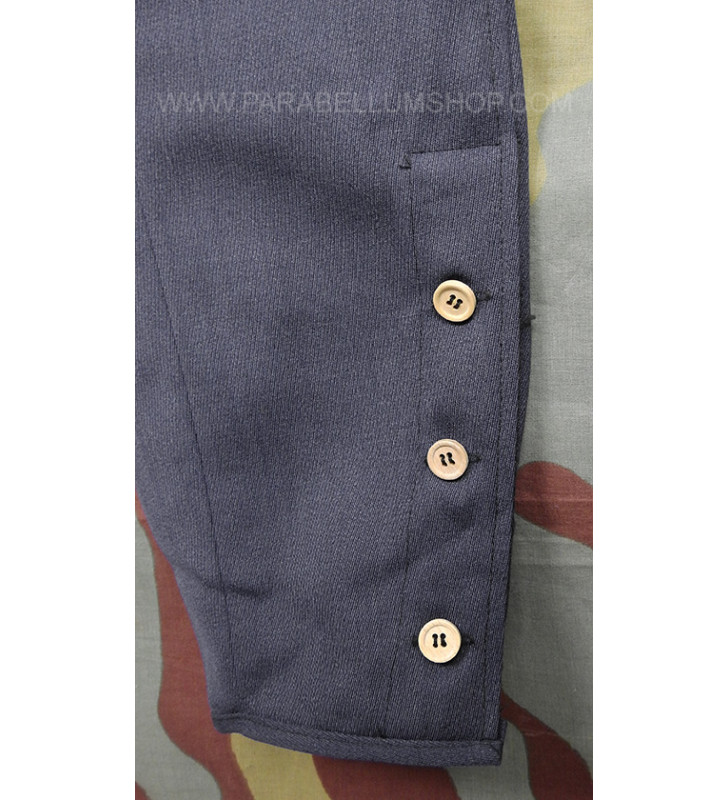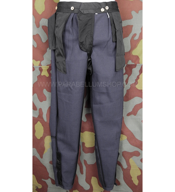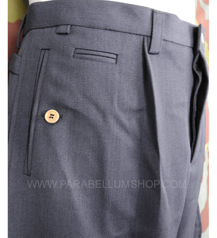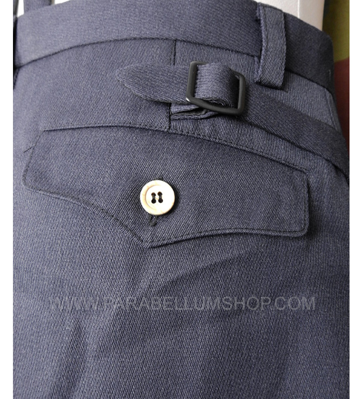 Blaugrau gabardine cloth trousers reproducing the jodhpurs model that the army officers used to make tailoring, characterizing it with all the peculiarities that characterized the officers' service uniforms. Two pockets are on front and one back with flap, one strap on each side for regulation of waist.