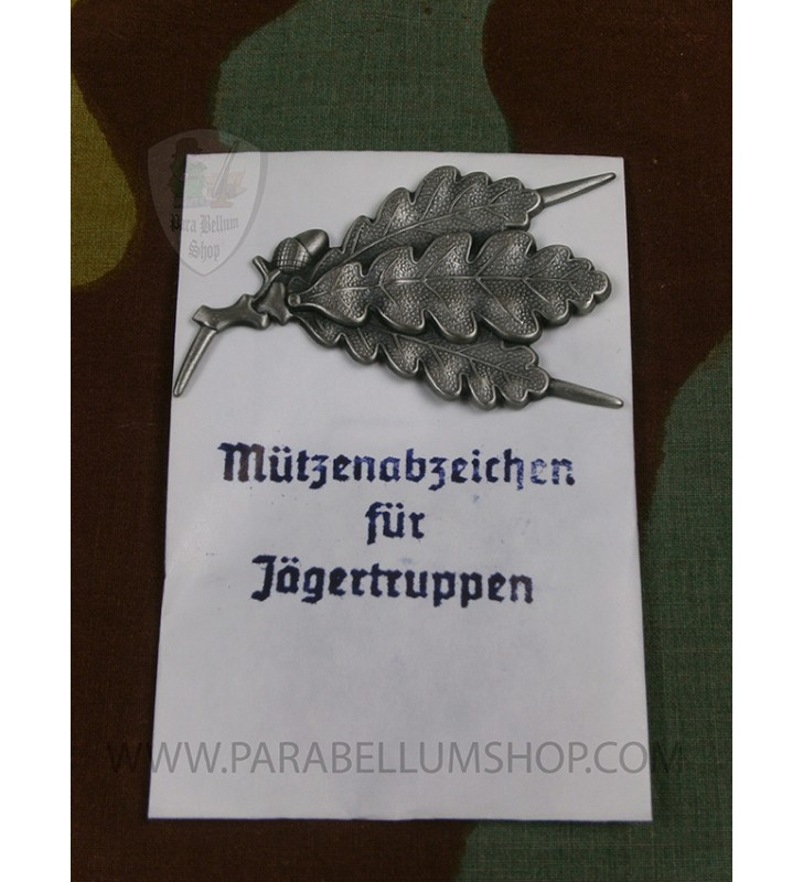 Reproduction of oak leaf in the model used in World War II, and in particular this was the model of the famous Heeres Kleiderkasse in Berlin, the Wehrmacht's official quality store. Made in metal and to apply on the feldmutze that characterized the light infantry units of the Wehrmacht. Applied on the left side of the feldmutze by three pins.