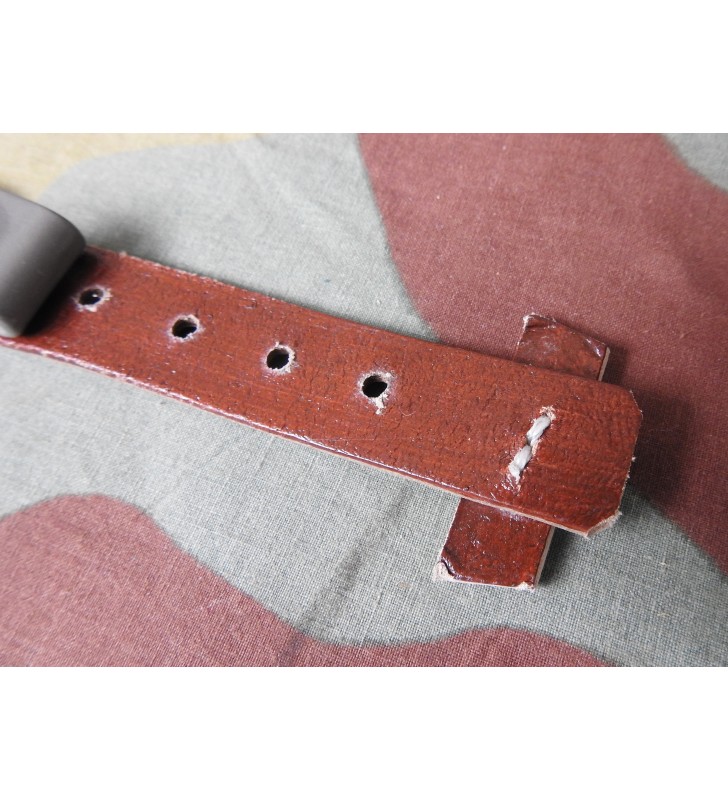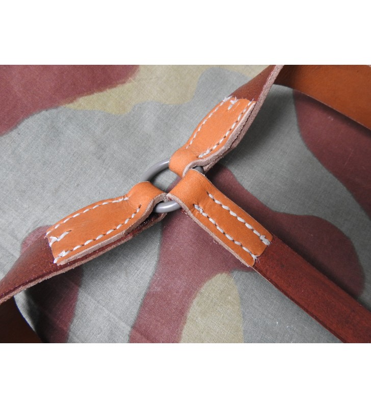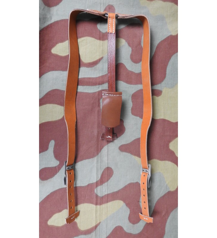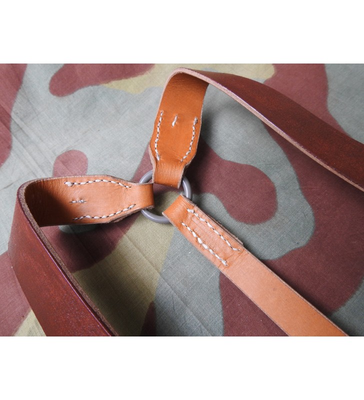 Reproduction of the light "Y" straps in brown leather used in the Luftwaffe for the Fallschirmjäger, Flak, or the officers, and later to the ground units of the Luftwaffe, the Felddivision. Characterized by the lack of secondary belts for the backpack or the Sturmgepäck, it consists of three parts with fixed hooks on the adjustable length of the strap and the back is covered by a flap of skin. Complete with the manufacturer stamps.