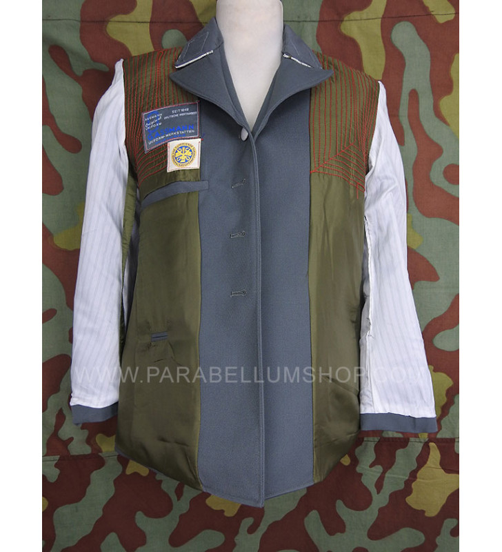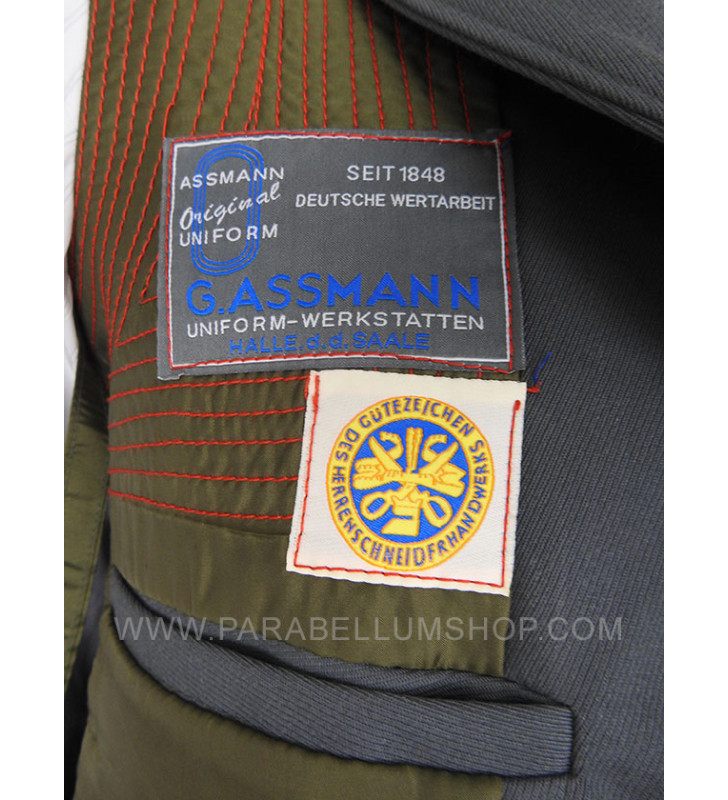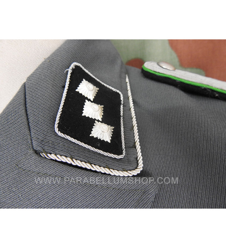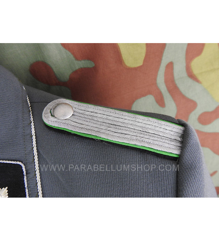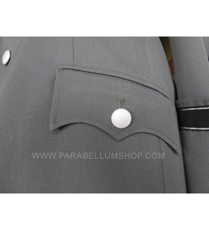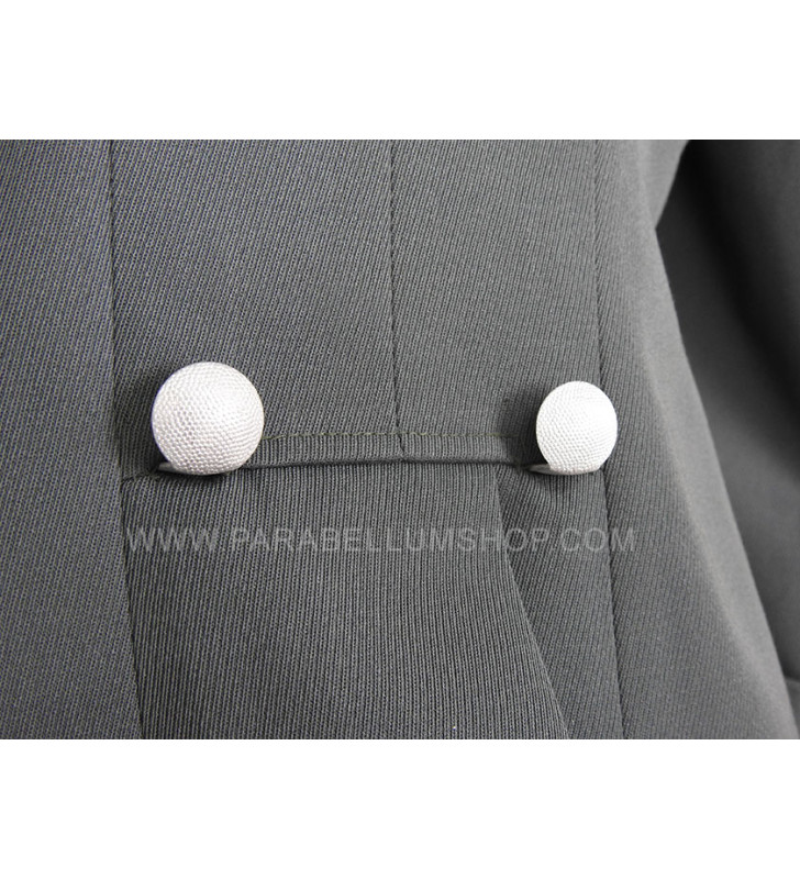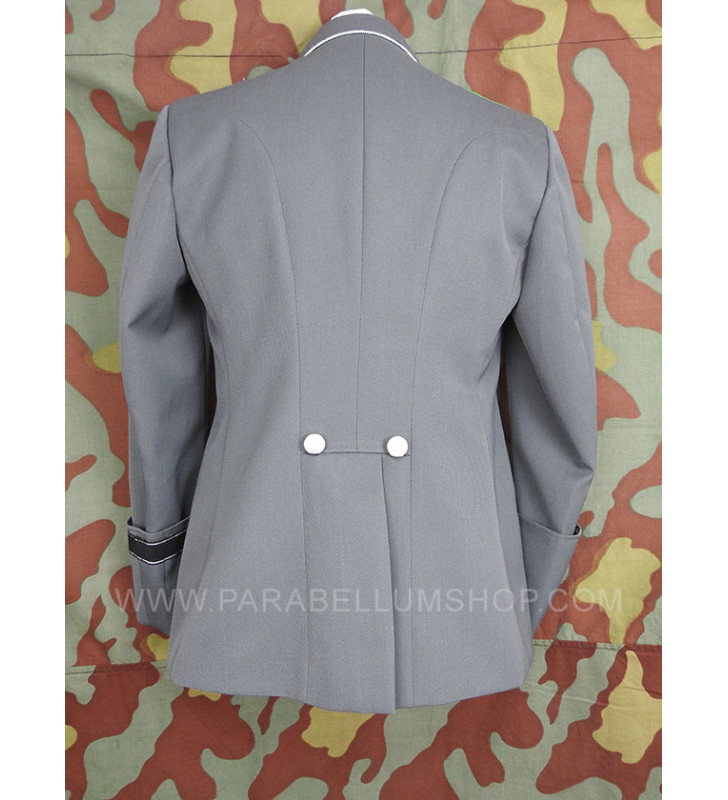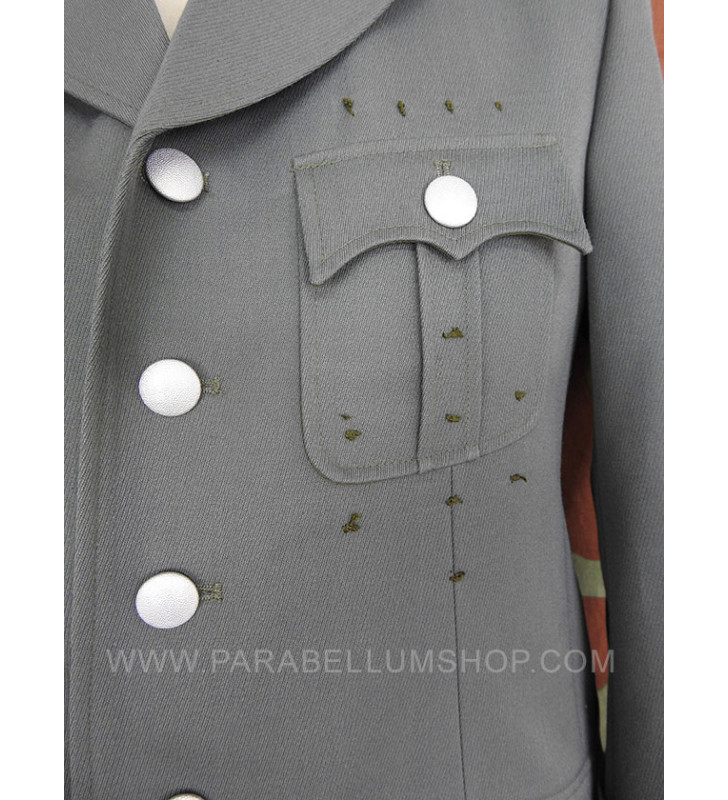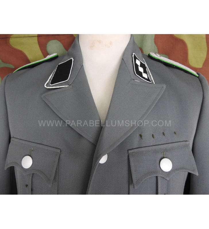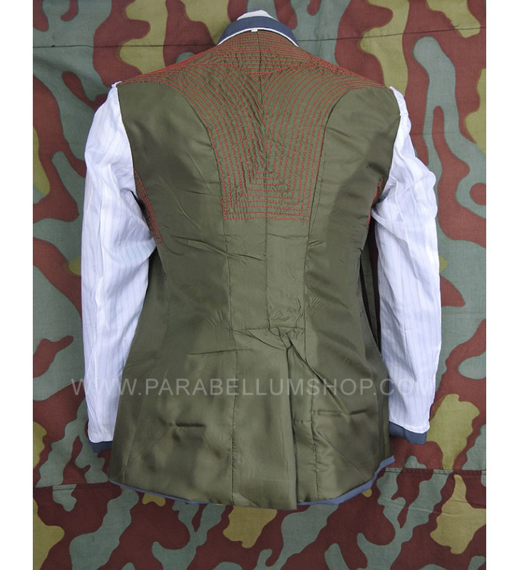 Gabardine feldgrau jacket reproducing the service model for the SD officers in the M34/36 model. Internally it is lined with fabric reproducing the rayon, or artificial silk, the shoulder board are sewn on the shoulder, the high collar with embroidered tabs and the sleeve with the double finish. The lower left pocket is also set up to house the officer's frog, and the manufacturer's labels are sewn internally and the owner's name is written. Made with care in every detail is complete with insignia, shoulder pads and eagle in the chosen grade.