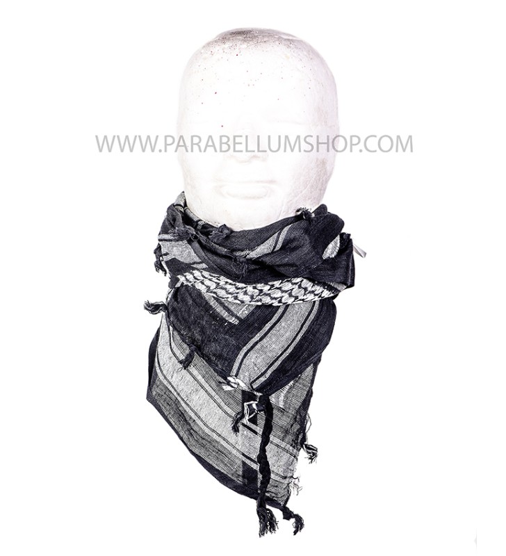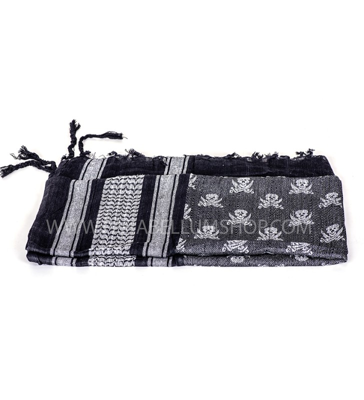 Scarf/shawl kefiah type decorated with a skull motif. Scarf of Arab origin and originally designed to provide protection in the deserts against the sun, wind, sand and at night from the cold. Used by military from all the world, it is also excellent for airsoft, hiking, traveling or any other outdoor use. Used for the first time by British special forces in North Africa during the Second World War, it is currently supplied to the British army and others throughout the world. Highly versatile it can be worn in many ways: headgear, veil for the face, scarf, protection from the sun.