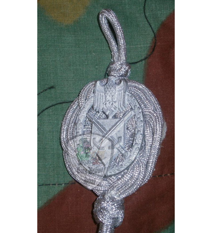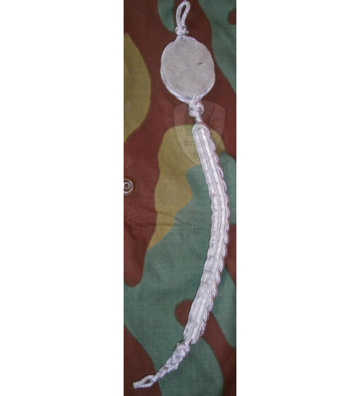 Reproduction of the Cord for Sharpshooter, Schutzen Abzeichen des Deutschen Heeres, the Wehrmacht that rewarded the shooting ability of the soldiers or NCOs. The cord is made of a braided aluminum semi-gloss that close to one end supports a metal plate with eagle, shield and two crossed swords. This title plaque replaced the previous model in 1939, and was placed under the right shoulder and stopped with a special hook and the other end under the second button from the top of feldbluse. The decoration of 12 planned levels, the sale is the first level.