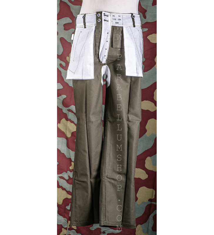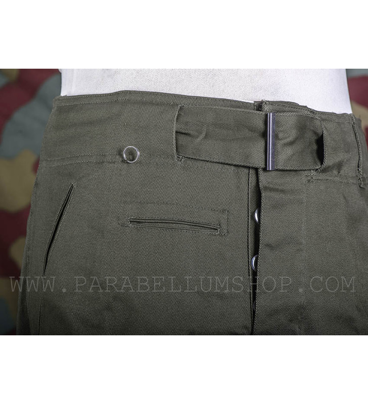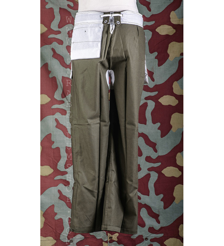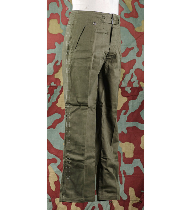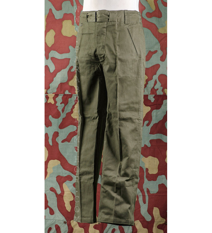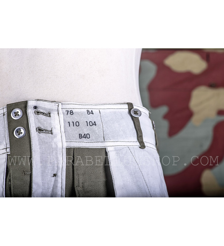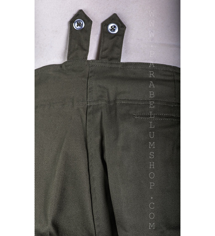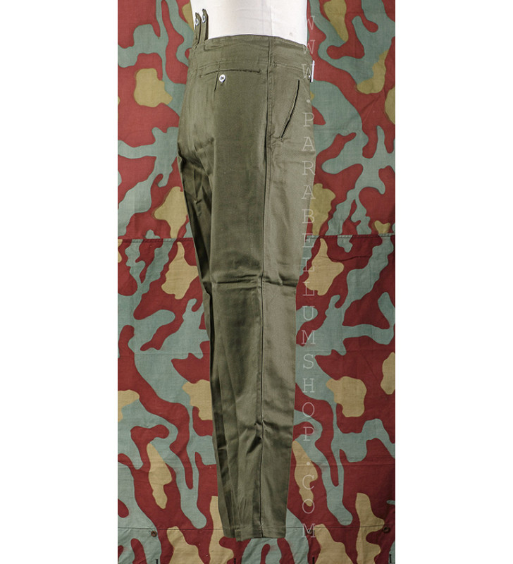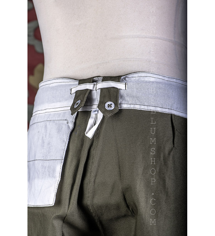 Made with the same fabric of tropical jacke, are in wide style. Bear two pockets on the sides and a rear closed by a button, a little pocket for the clock is located on the front; it's equipped with an internal belt fitted with a buckle and at the same time wit internal buttons for braces. All the buttons are concave and metal.