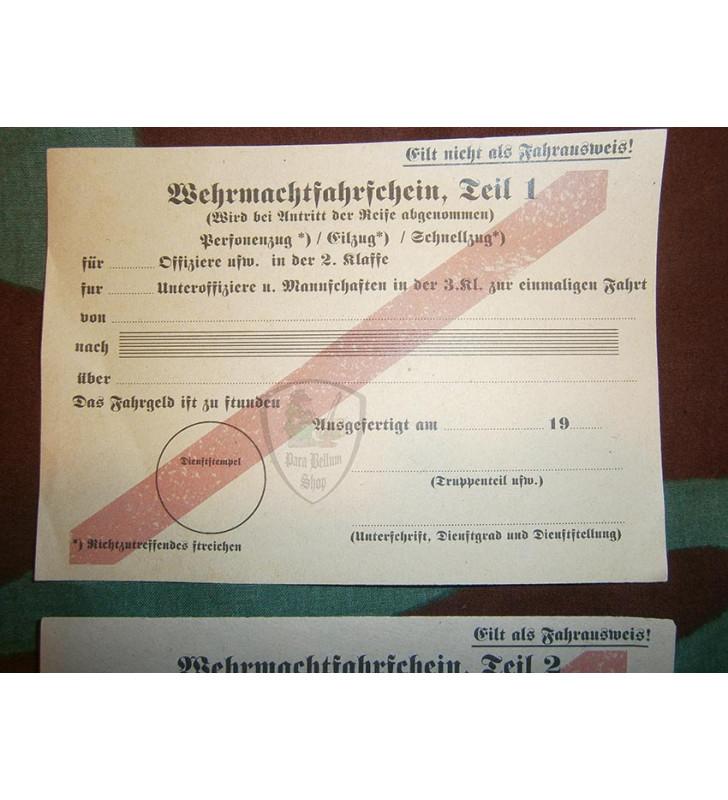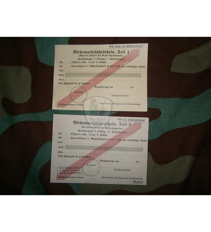 Reproduction of the Wehrmacht military railway ticket that authorize the movement on the lines. It composed of two parts, one to be delivered and the other to be preserved as evidence.