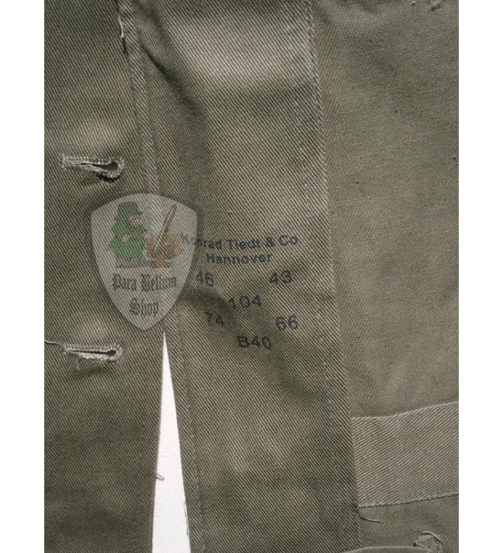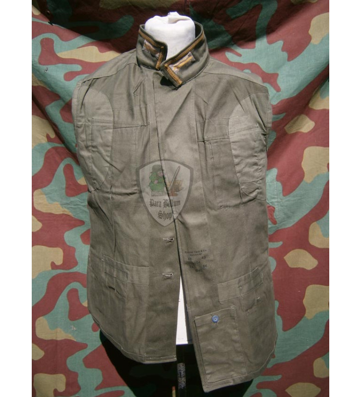 In force since 1941, the cut was very close to the M36 but with a fabric made of cotton such as hemp in officially color green olive. Four pockets with flap folds and pointed, metal buttons painted in olive green, with sleeves slit and two metal buttons to adjust the size, split on the back for easy movement and an open collar. The jacket is a faithful copy of the original, internally reinforced by cotton rough, on the right and left side there are two series of three holes to adjust the hooks to support the belt and the front is the pocket for the medication. The buttons are set through a system of metal hooks on the jacket.