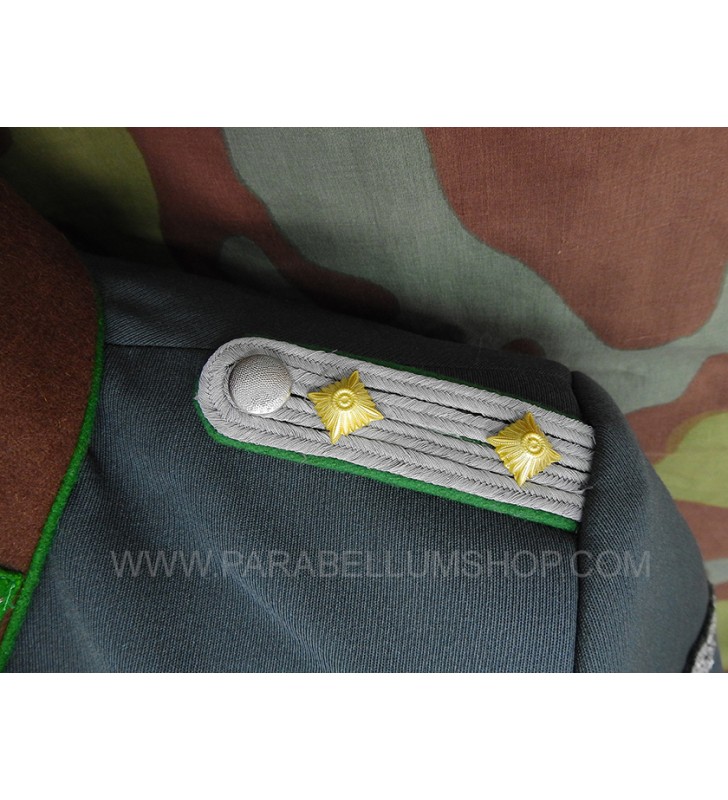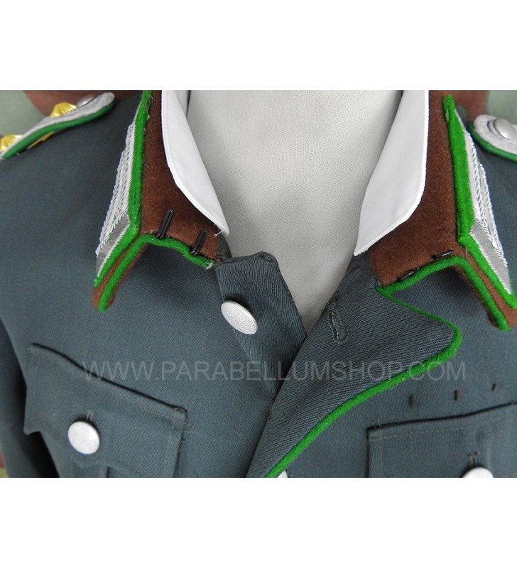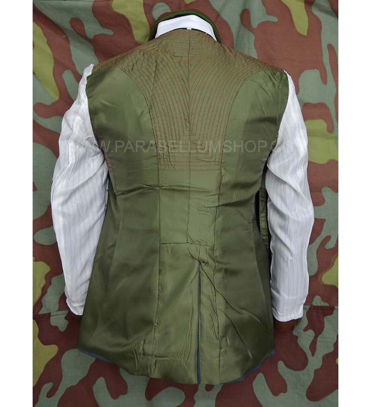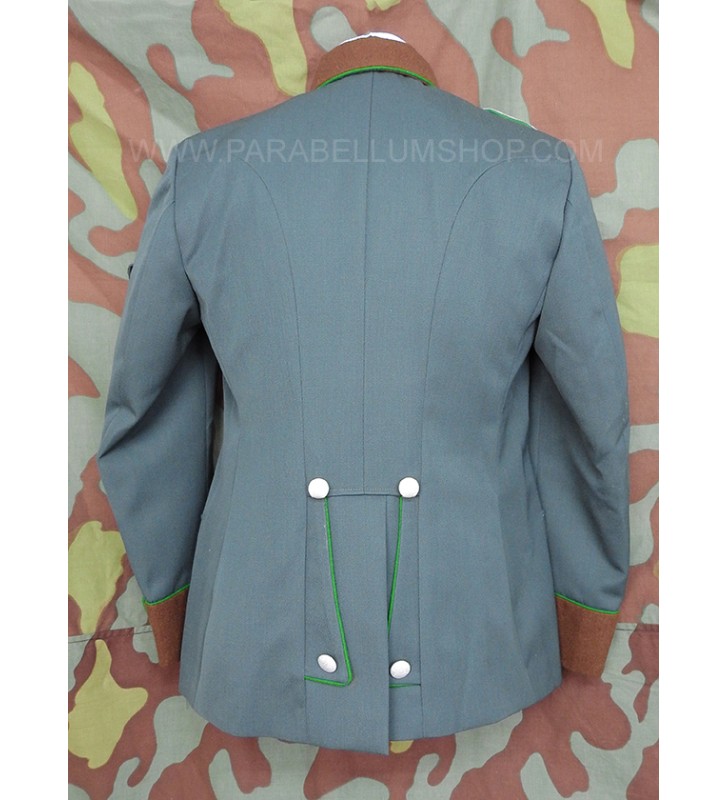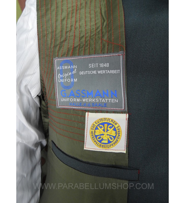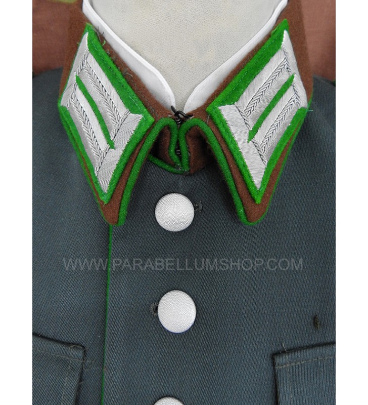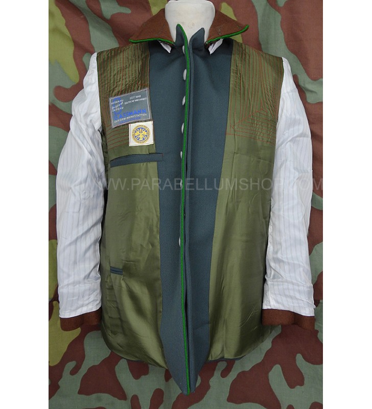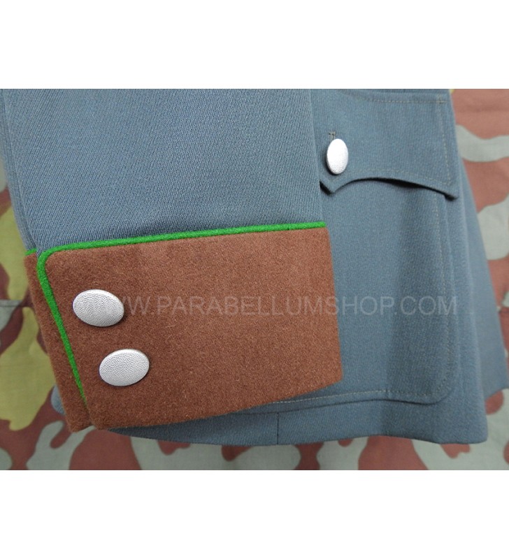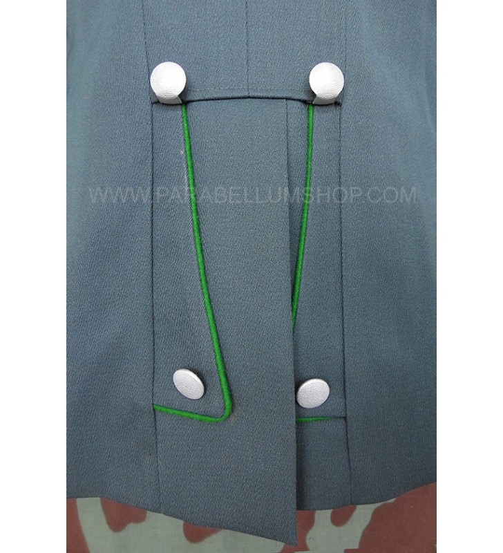 Gabardine feldgrau jacket reproducing the service model for the Ordnungs Polizei officers. Internally it is lined with fabric reproducing the rayon, or artificial silk, the shoulder board are sewn on the shoulder, the high collar with embroidered tabs and the sleeve with the double finish. The lower left pocket is also set up to house the officer's frog, and the manufacturer's labels are sewn internally and the owner's name is written. Made with care in every detail is complete with insignia, shoulder pads and eagle in the chosen grade.