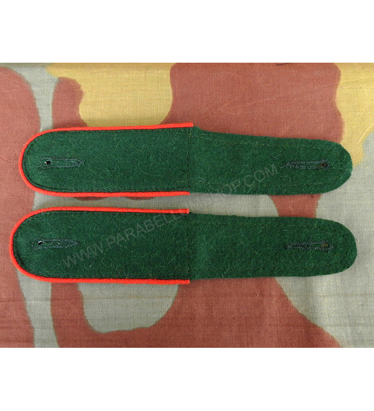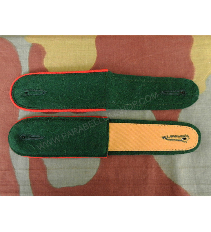 Riproduzione delle spalline M36 da soldato di artiglieria in panno verde bottiglia e waffenfarbe rosso, dal grado di Schutze a quello di Stabsgefreiter in uso durante la Seconda Guerra Mondiale sulle feldbluse della Heer della Wehrmacht.