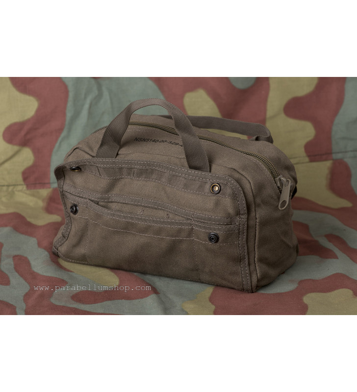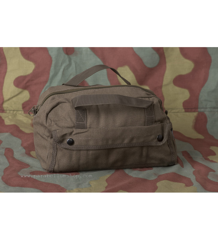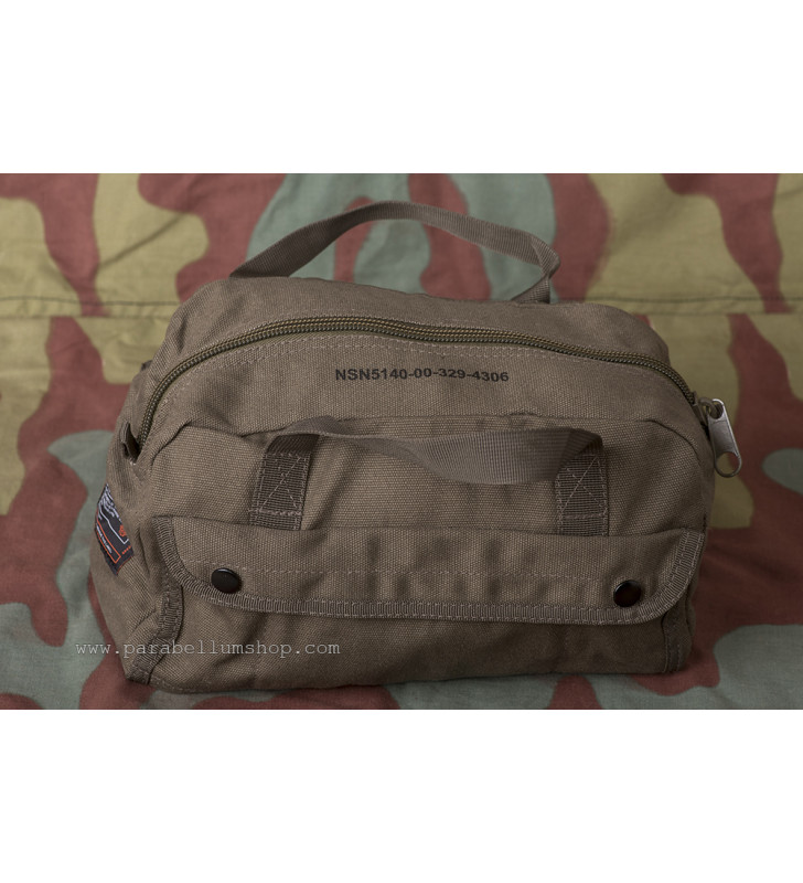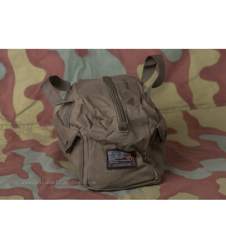Utilissimo borsone porta attrezzi in tela di cotone di colore verde oliva con grande tasca principale al cui interno sono presenti scomparti per attrezzi, più due tasche laterali suddivise e con chiusura a pressione.