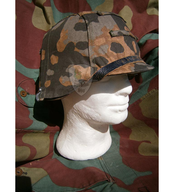Riproduzione del copri elmetto nel mimetismo platanentarn n°3 delle Waffen SS, con sistema di aggancio al guscio per mezzo di tre ganci a mezza luna con sistema elasticizzato per adattarsi all'elmetto. Il telino è completamente reversibile, primavera/autunno, con strisce di tessuto cucite per permettere di inserire arbusti per una maggiore mimetizzazione.
