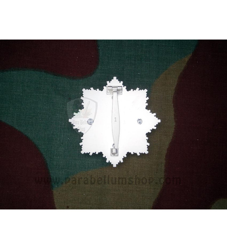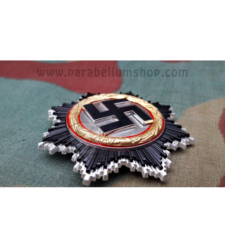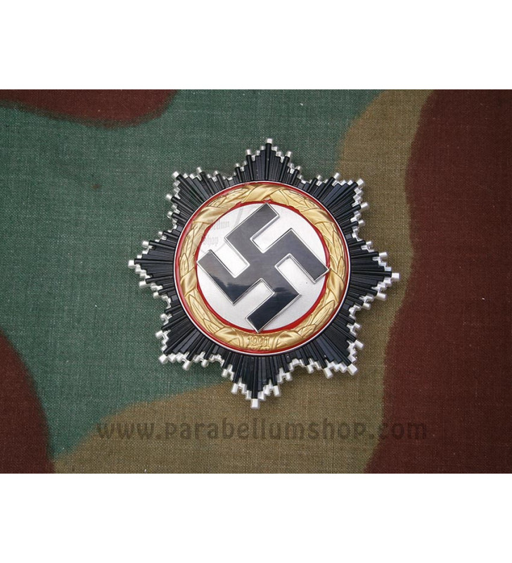 Riproduzione di ottima qualità della Croce di Germania in oro, Kreigsorder Des Deutschen Kreuzen, creata il 28 settembre 1941 da Adolf Hitler spinto anche dalla campagna nell'Est in corso. La croce aveva lo scopo di premiare i soldati che si erano distinti per valore e coraggio sul campo di battaglia essendo protagonisti di azioni che erano ben più meritevoli di quanto la Croce di Ferro di I^ classe premiasse ma che al contempo non fossero sufficienti per una Croce di Cavaliere della Croce di Ferro. L'assegnazione poteva avvenire per ogni grado quindi truppa, sottufficiali e ufficiali e il requisito precedente era quello di essere già in possesso della Croce di Ferro di I^cl e di II^cl. anche nella versione di riconferma di quella della Prima Guerra Mondiale. La dimostrazione sul campo di battaglia di eccezionali doti di comando delle truppe erano un altra motivo di assegnazione. Una decorazione che era separata dalla Croce di Cavaliere e che poteva essere conferita anche avendo già ricevuto tale decorazione.