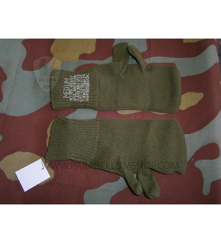 Guanti a manopola con il dito per il grilletto in colore verde oliva dello US Army con stampato su di un lato lotto, taglia e dati di produzione.