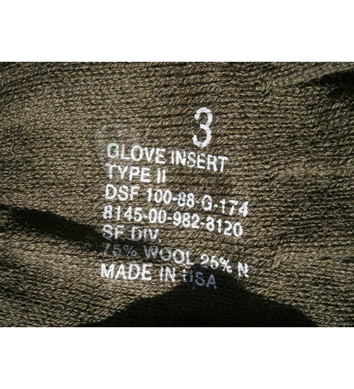 Guanti verde oliva US Army con stampato su di un lato lotto, taglia e dati di produzione.