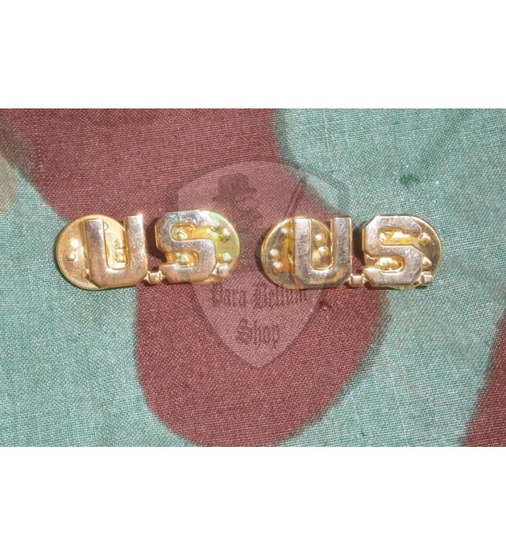 Riproduzione delle insegne da colletto in metallo per ufficiale dello US Army, consistenti nel monogramma US, da applicare sul bavero per mezzo di spilla a pressione con chiusura ed utilizzate durante la Seconda Guerra Mondiale.
