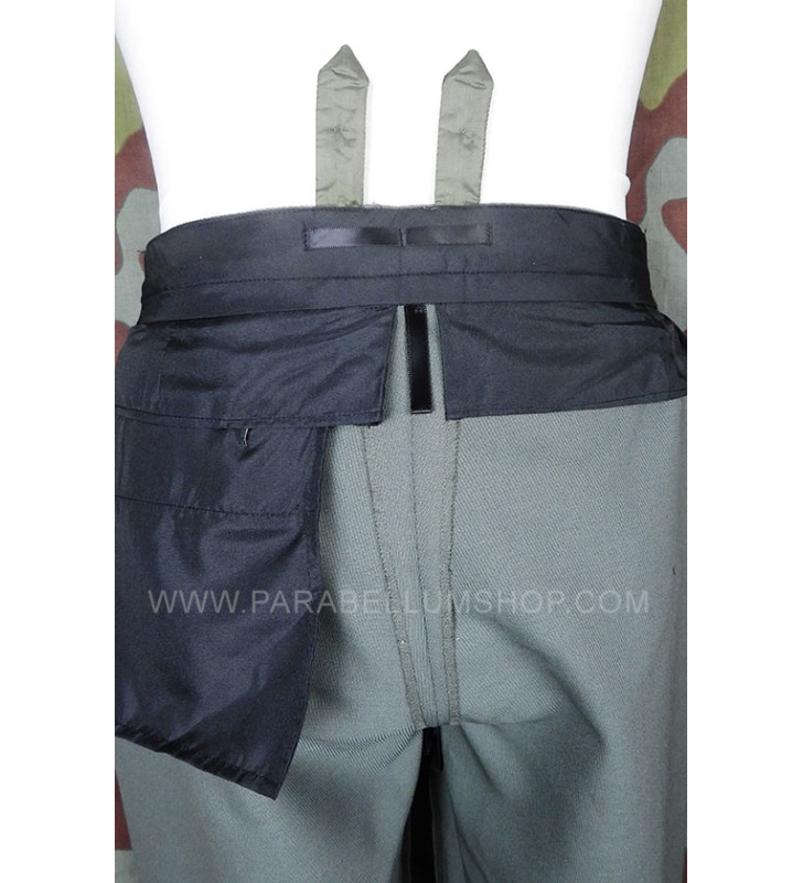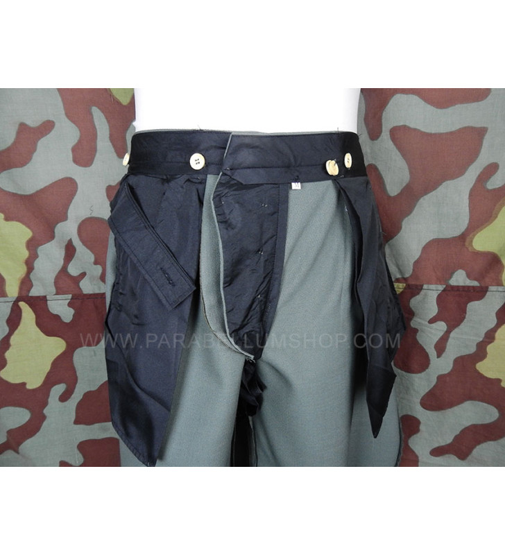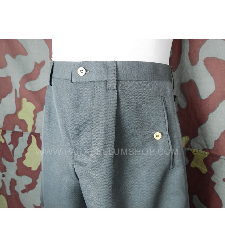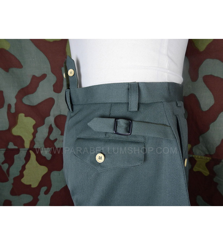 Pantalone in gabardina feldgrau riproducente il modello alla "cavallerizza" che gli ufficiali della Heer solevano farsi realizzare di sartoria, caratterizzandolo con tutte le peculiarità che contraddistinguevano le uniformi di servizio degli ufficiali. Il pantalone ha due tasche a taglio anteriori e una posteriore, patta chiusa con bottoni e alle caviglie la chiusura con bottoni.