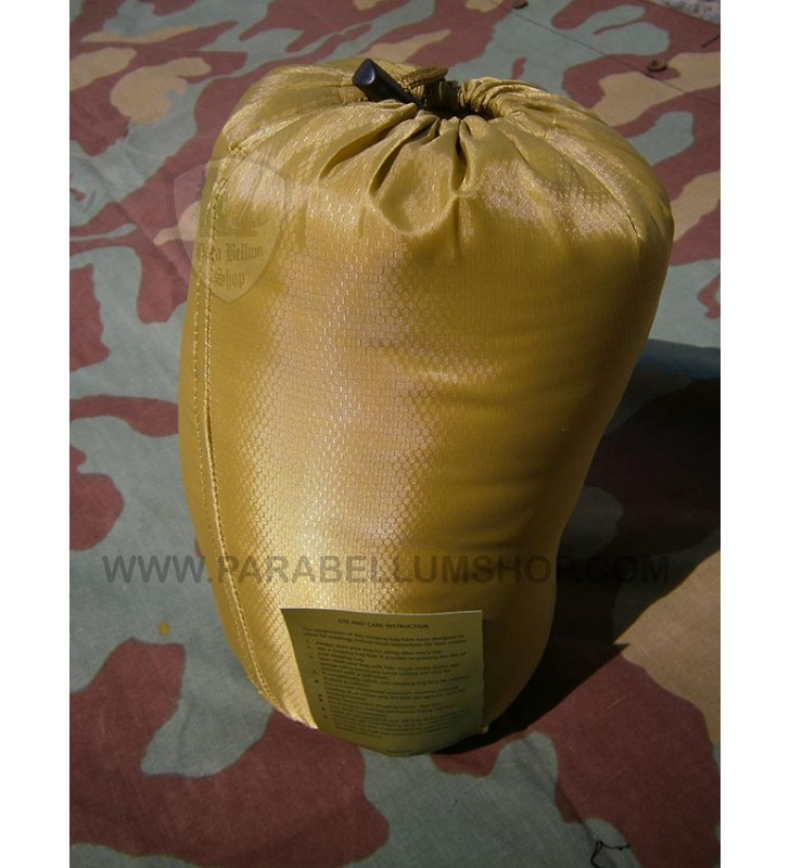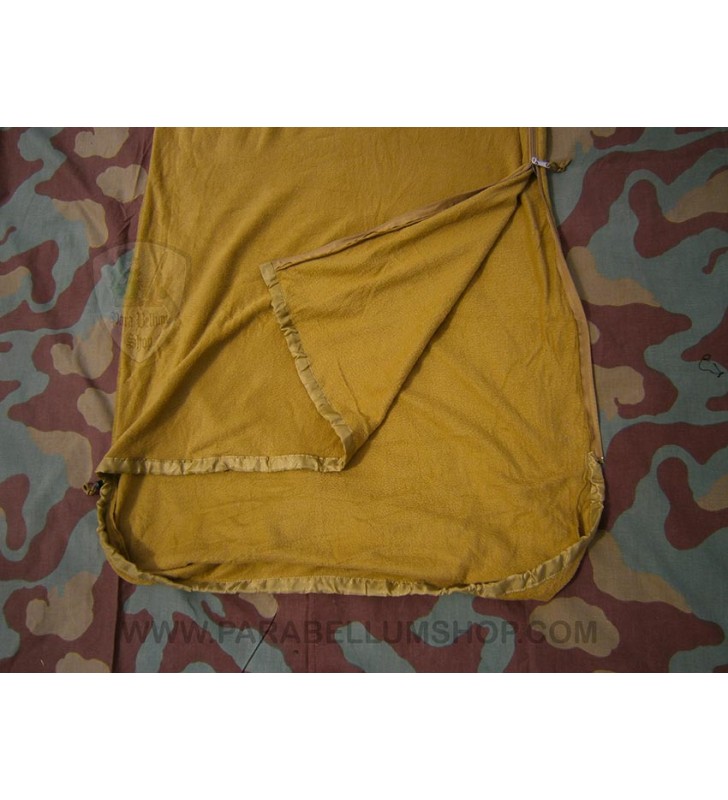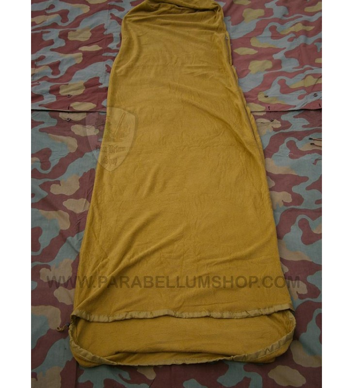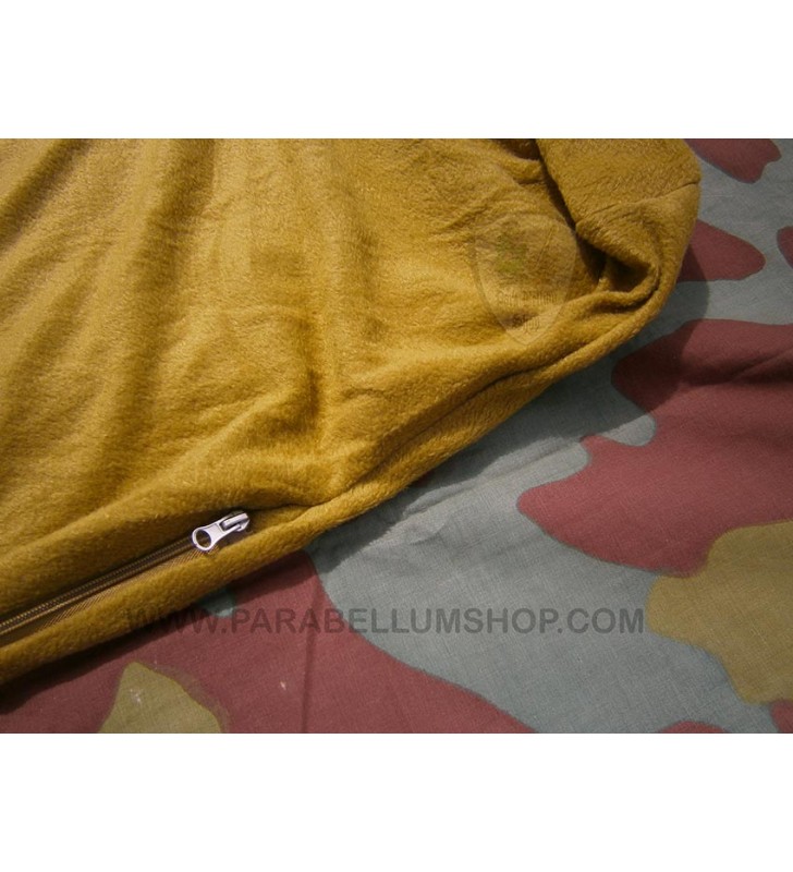 Sacco a pelo estivo in colore coyote, utilizzabile anche come coperta, con cappuccio con coulisse, cerniera doppia, tessuto tipo pile che lo rende confortevole rispetto al classico in nuda plastica e completo della sua sacchetta di trasporto.