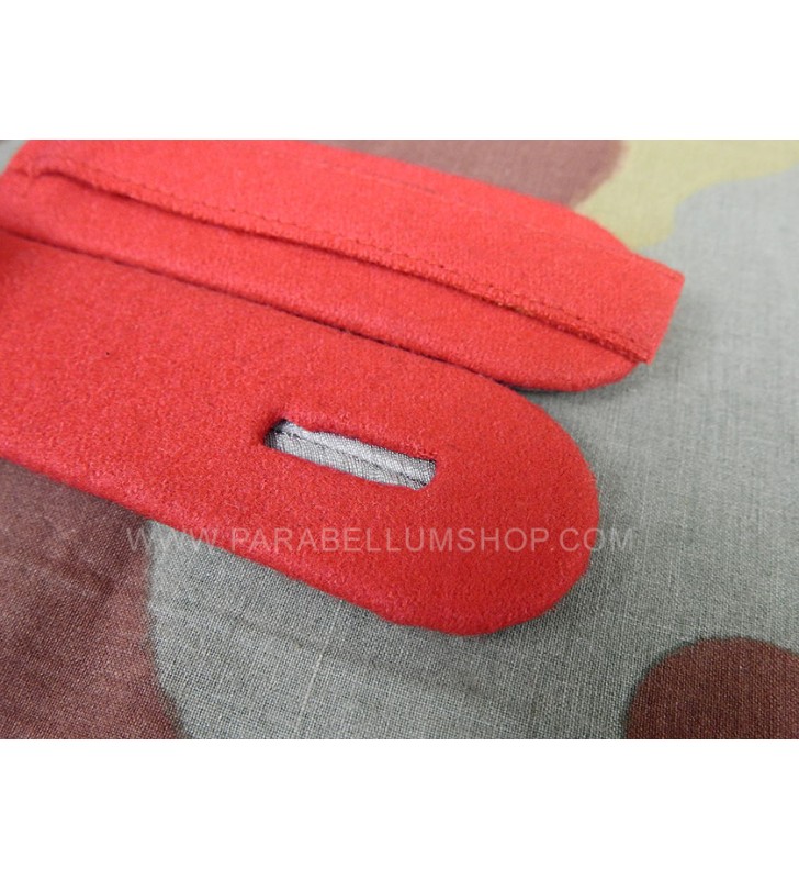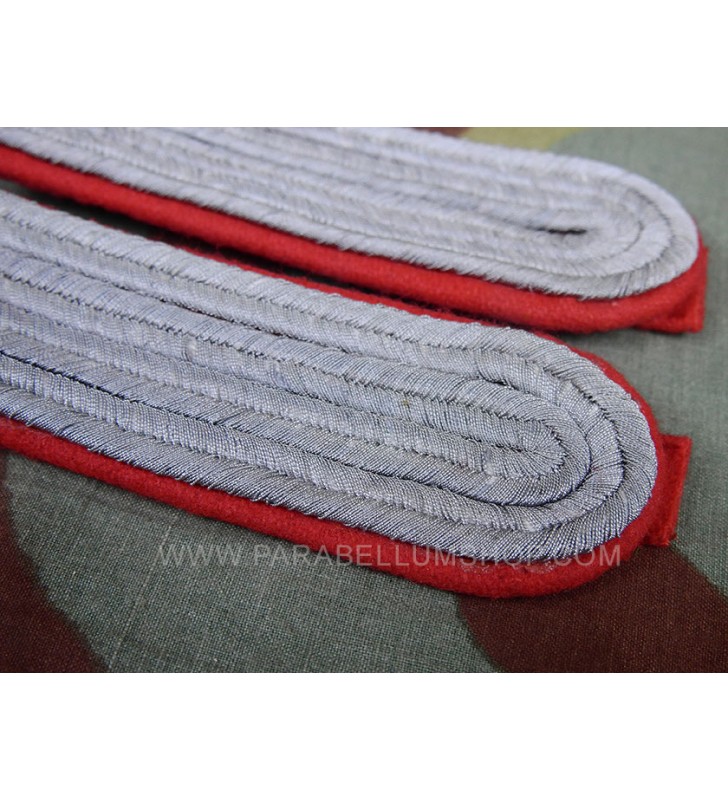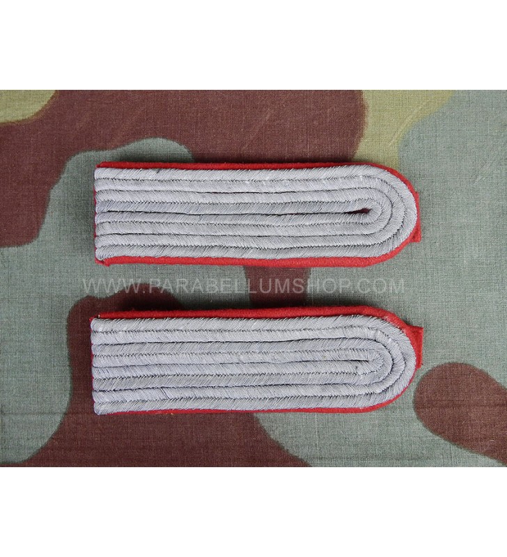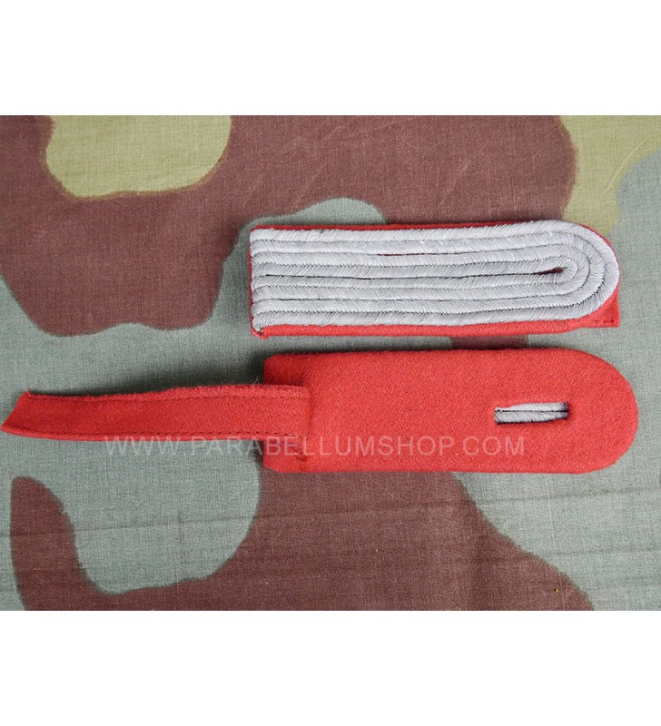 Riproduzione delle spalline da sottotenente, Leutnant, del corpo dell'artiglieria della Heer della Wehrmacht, caratterizzate dal sotto panno in colore rosso e dall'intrecciato in filo metallico. Completa del sotto spallina per il fissaggio sulle feldbluse.