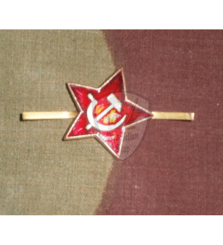 Riproduzione della stella in metallo smaltata di rosso con falce e martello che veniva applicata sulle bustine dell'Armata Rossa durante la Seconda Guerra Mondiale. Sul retro due fermagli in metallo assicurano il bloccaggio del distintivo sulla bustina.